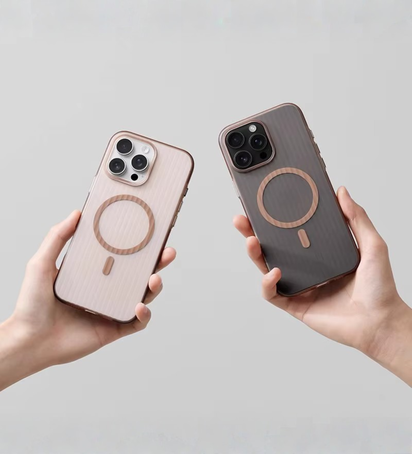 MagSafe case for iPhone with corrugated design in Dessert Titanium, featuring non-slip grip and seamless charging support.