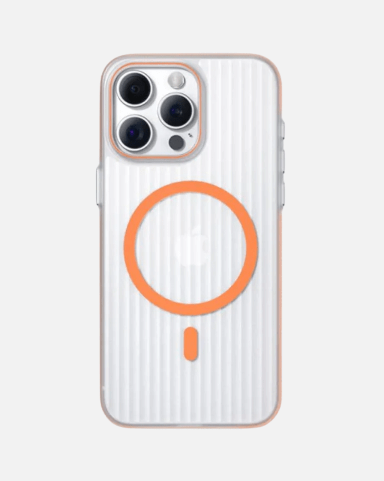 Protect your iPhone in bold style with the MagSafe-Compatible Corrugated Edge Case in striking Orange. Designed for maximum grip and minimal slip, this premium case blends high-impact protection with seamless MagSafe charging support. The unique ridged texture on the sides offers a tactile, secure hold—perfect for everyday drops, slips, and the hustle of daily life.