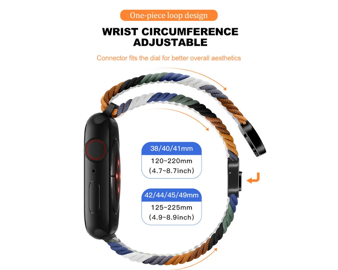 Designed with a one-piece adjustable loop, this braided Apple Watch band offers a precise fit for any wrist size. The flexible connector hugs your dial seamlessly for a sleek, unified look. Whether 38mm or 49mm, enjoy custom comfort with every wear - no gaps, no pinching, just perfect balance and style.