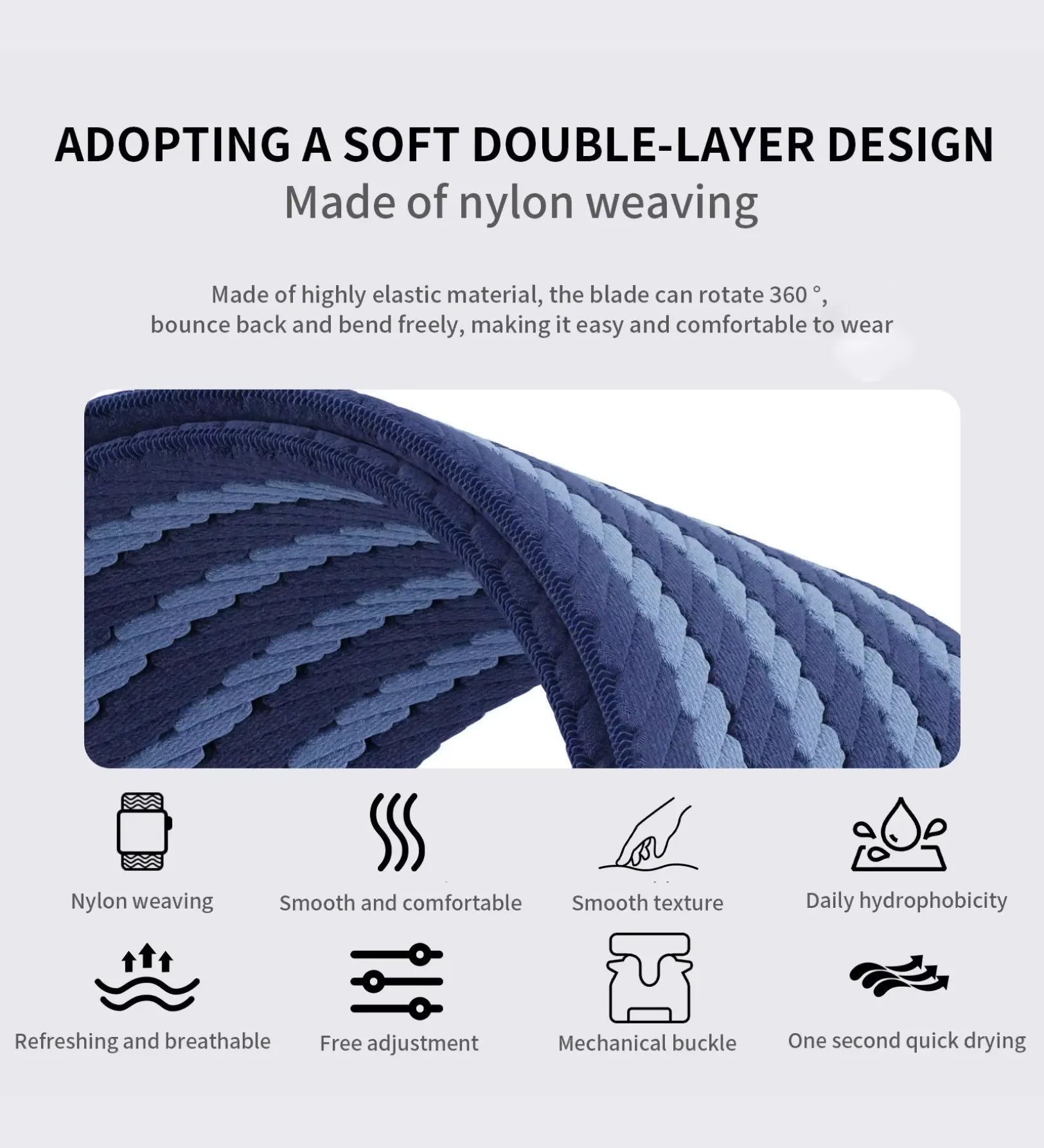 Crafted with a premium double-layer nylon weave, this Apple Watch band delivers a smooth texture, breathable feel, and lasting durability. The flexible fabric bends naturally with your wrist while staying cool and quick-dry, Perfect for all-day wear, workouts, and daily adventures.